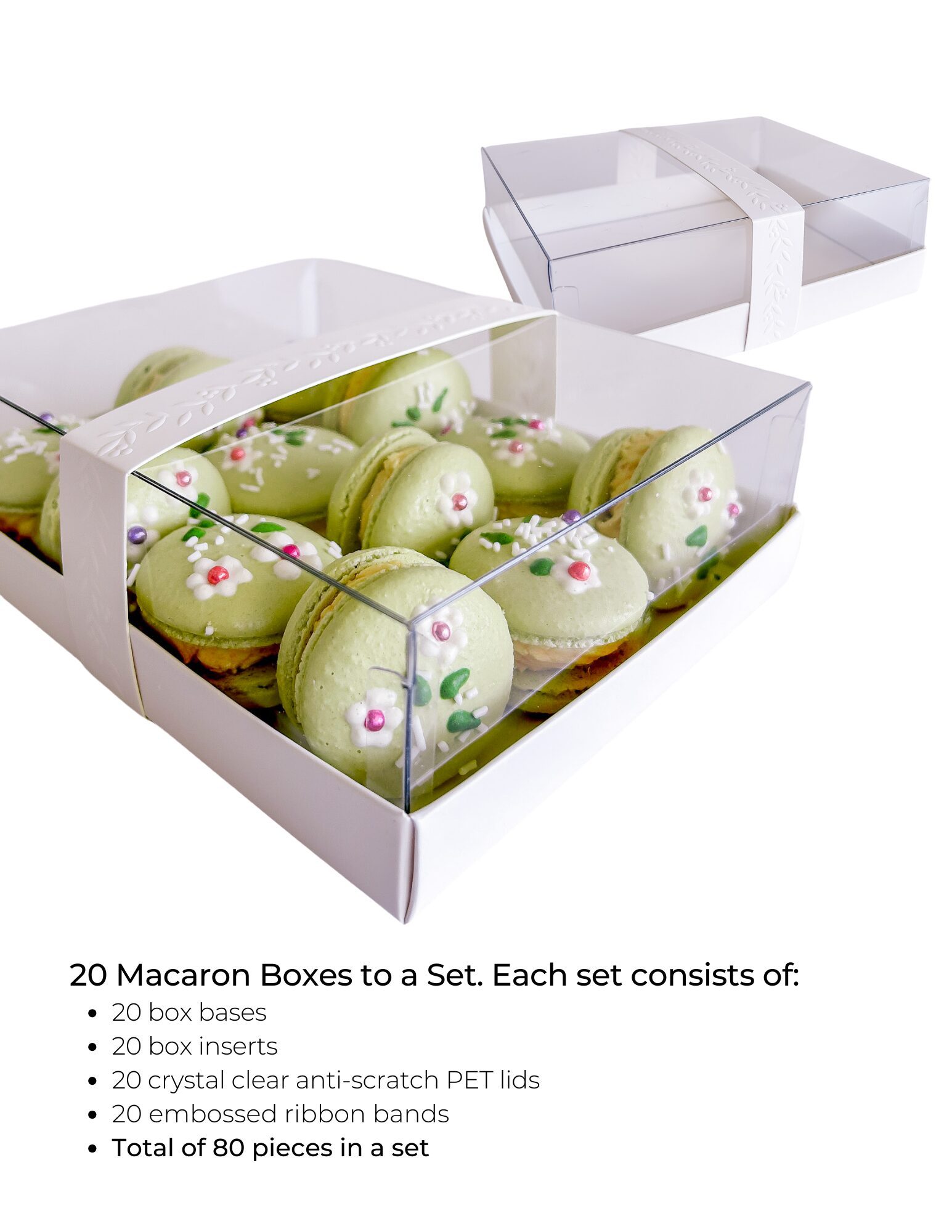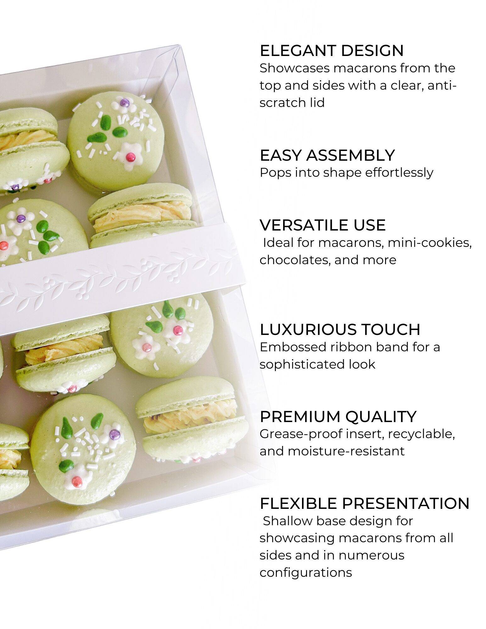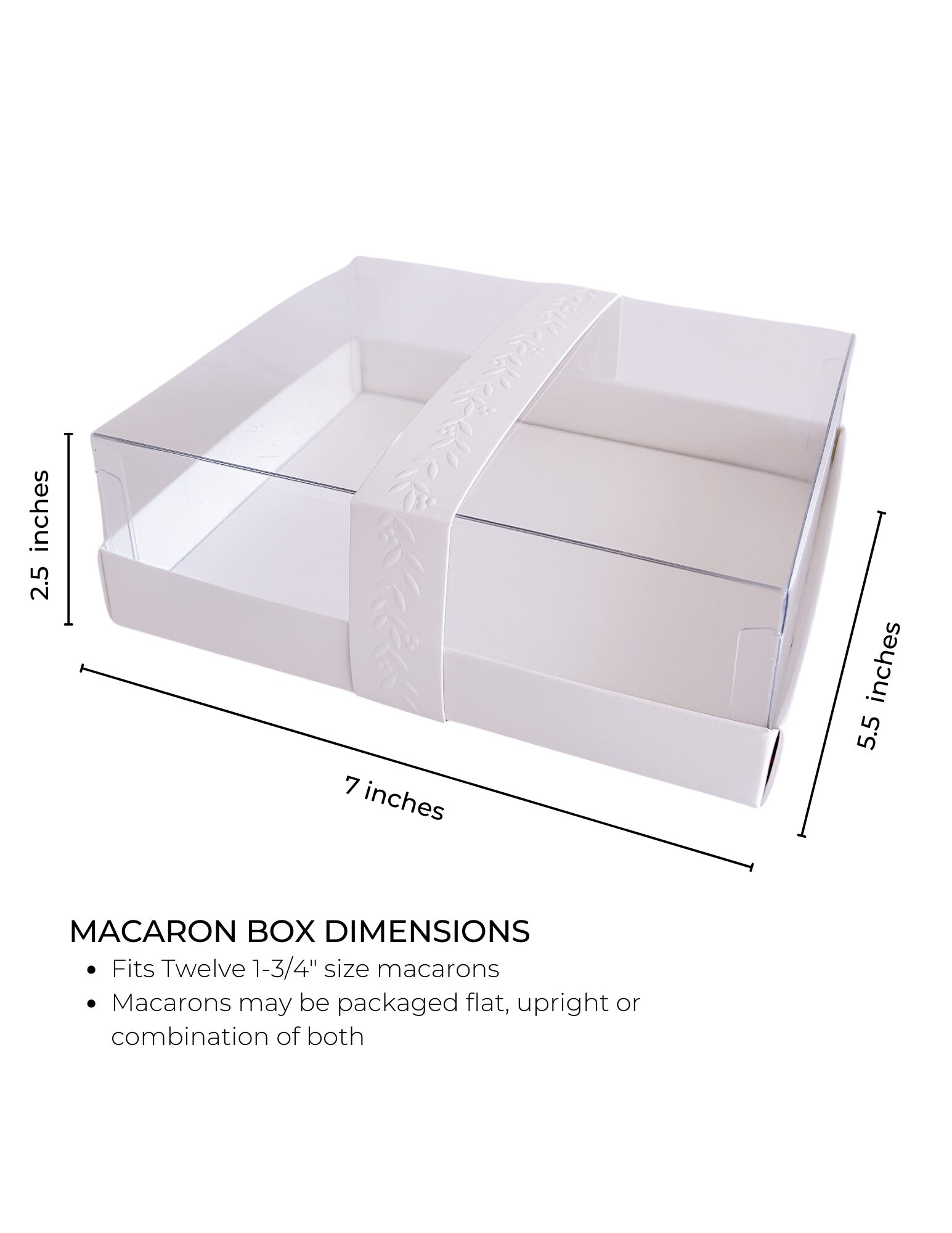 PREMIUM MATERIALS AND DESIGN. Each macaron gift box measures 5.5” wide, 7.0” long, and 2.5” tall, featuring a grease-proof, FDA-approved insert for food safety, and an elegant ribbon band embossed with a leaf scroll design for a luxurious touch