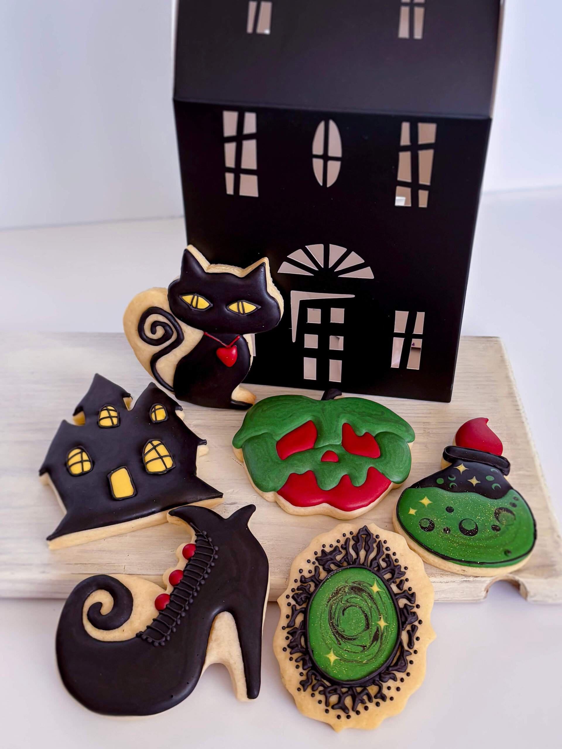 Step into a world of spooky fairytales with our Fairest One of All October cookie decorating class! Perfect for both beginners and experienced decorators, this class is open to adults and creative kids alike. You’ll learn to decorate enchanting cookies like a poison apple, witch’s boot, bubbling potion, haunted castle, magic mirror, and more. It’s such a fun twist on Halloween — not your typical pumpkins and ghosts! Optional add-ons include my custom-designed cookie cutters, take-home kits to keep the creativity going, and haunted house cookie packaging to package your treats in style.